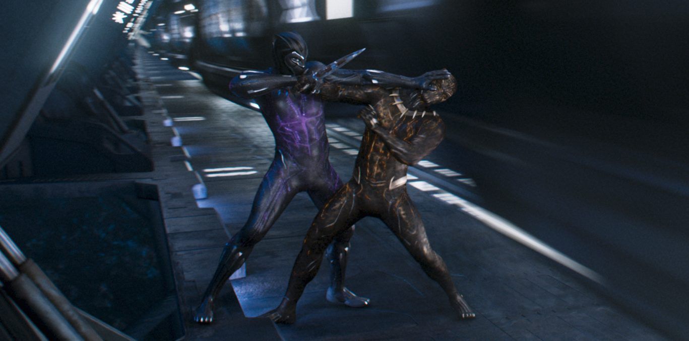 A pesar de la experiencia de T'Challa con la Hierba, la experiencia militar de Killmonger seguía siendo demasiado para T'Challa. Sin embargo, cuando la lucha se dirigió a las vías del tren maglev de Vibranium, T'Challa supo que podía utilizar los amortiguadores de Vibranium en su beneficio. Los amortiguadores se activaron cuando pasó el siguiente tren, anulando los nanites de Vibranium de sus trajes. Con una voltereta y un puñal bien colocado, T'Challa puso fin a la pelea; Killmonger no lo vio venir e incluso admitió que fue una gran jugada.