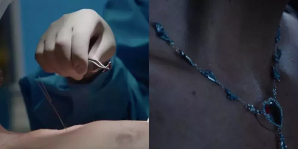 Esas piezas metálicas y lo que parece un abalorio son en realidad los trozos de metralla extraídos del pecho de Tony durante la operación. Para algunos, es un recuerdo morboso de lo que le convirtió en Iron Man, pero para otros, es un bonito espejo de Pepper guardando el núcleo del reactor de arco que extrajo del pecho de Tony. Es un gesto de amor.