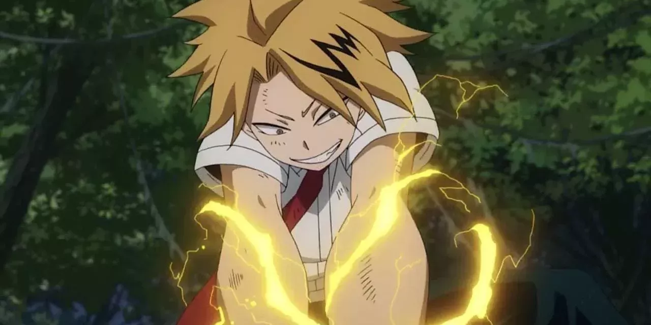 Izuku no es el único estudiante de la Clase 1-A que tiene un Quirk potencialmente peligroso. La Electrificación de Denki Kaminari le permite emanar un aura de electricidad que puede descargar al contacto. Pero si se pone al límite con Supermovimientos como Choque indiscriminado de 1,3 millones de voltios, cortocircuita su propio cerebro y se vuelve "estúpido" durante una hora.