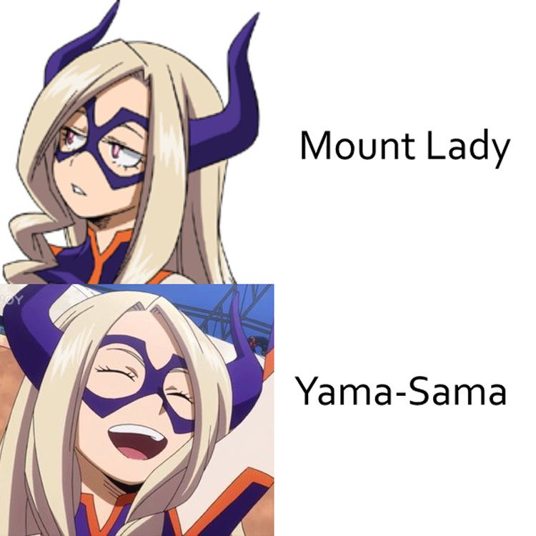 El verdadero nombre del héroe de la serie de Yu Takeyama, tanto en inglés como en japonés, es Mt. Lady. Este creador de memes parece pensar que hubiera sido más divertido que su nombre fuera Yama-Sama, que se traduce más o menos directamente como "montaña". La rima lo hace bastante divertido.