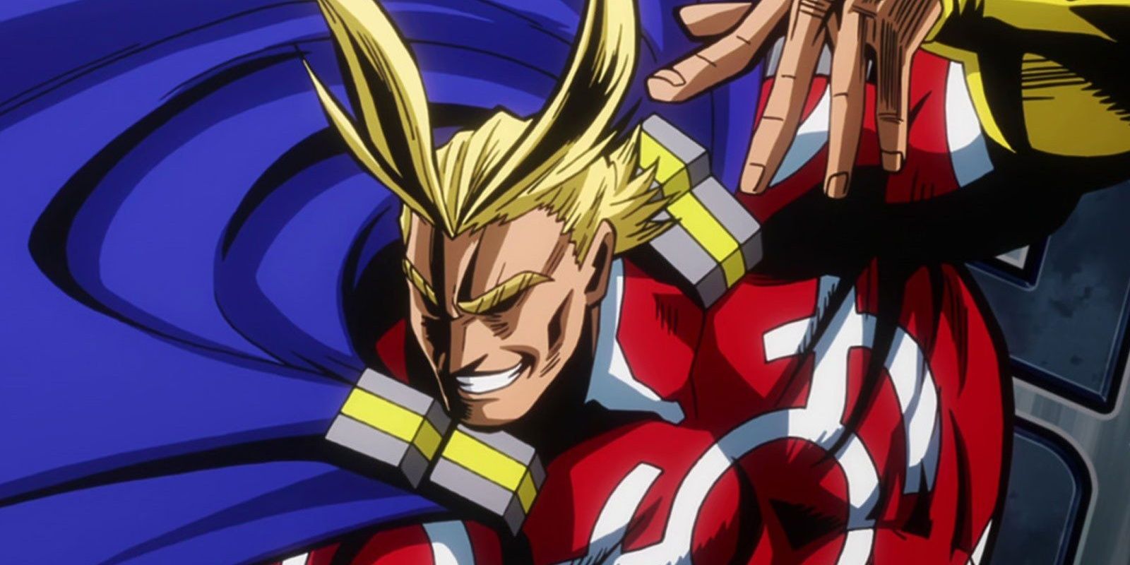 El esquema de color de su traje está arrancado directamente de la bandera americana, sus músculos abultados harían que incluso Hulk se sintiera orgulloso, y su brillante sonrisa y su fuerte mandíbula podrían mezclarse en cualquier anuncio de coches de los 50. Este hombre está de pie y orgulloso como un héroe tradicional debería, estableciendo el tono de toda la premisa de Mi Academia de Héroes con sólo una mirada.