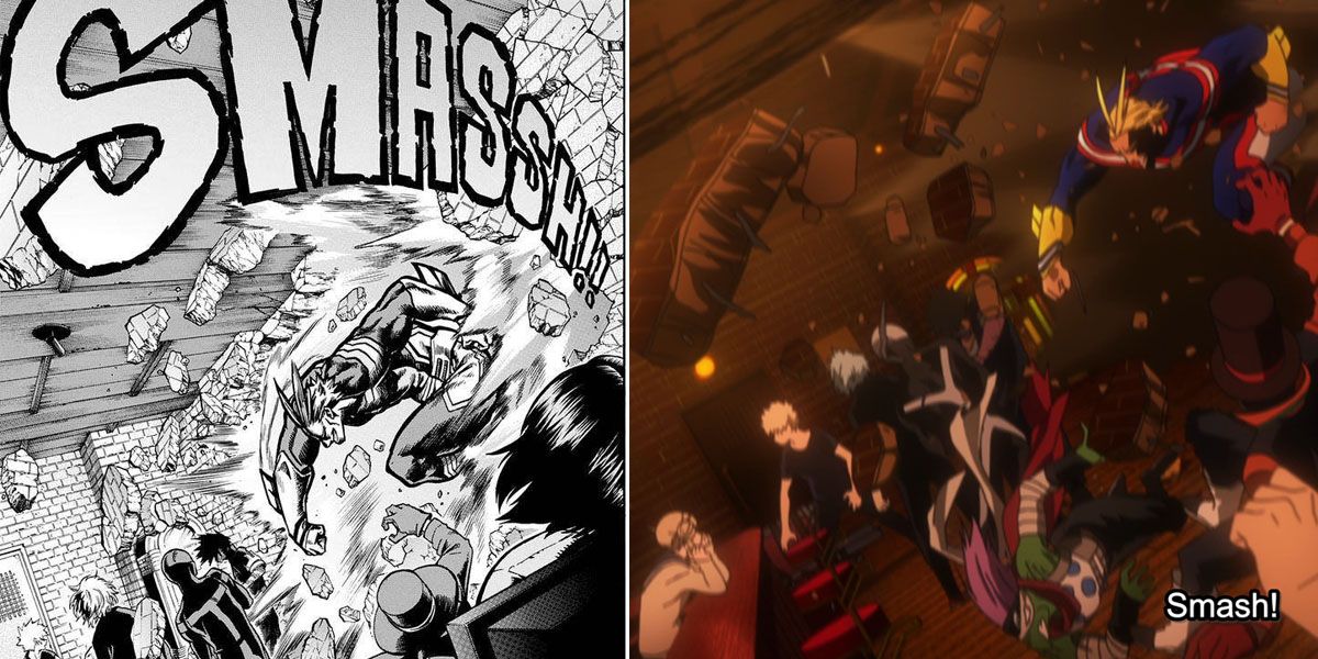Tanto en el manga como en el anime, la aparición de All Might aquà es llamativa. Su heroica entrada hace creer a los espectadores que los villanos no tienen ninguna posibilidad ahora que está allÃ, y parece que se estrella contra la pared como si no hubiera necesitado mucho esfuerzo. Como esta es una escena rápida en el anime, All Might se mueve tan rápido que aparece borroso en cada fotograma.