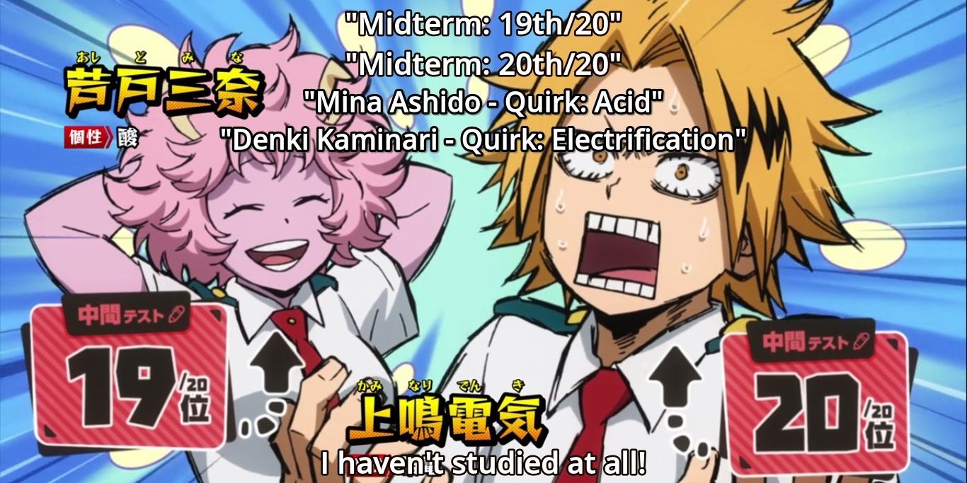 Para resumir: Mina Ashido y Denki tienen las peores notas en la clase de héroes 1-A. Lo interesante de mi Academia de Héroes es que Izuku, a pesar de haber nacido sin peculiaridades, no es el único estudiante que tiene algo de terreno que cubrir. Denki se asentó hasta el fondo, y está decidido a cambiar eso.