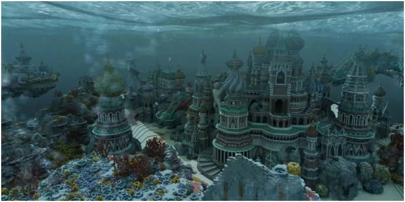 Construir bajo el agua es un auténtico suplicio, pero es tan genial que merece la pena. Algunas de las mejores construcciones tienen lugar en el fondo del océano y utilizan algunos de los bloques más bonitos del juego. Lo mejor es que pueden estar inundados y requerir la respiración acuática, el transeúnte de profundidad y otros encantamientos similares para atravesarlos, o pueden estar encerrados en cristal.