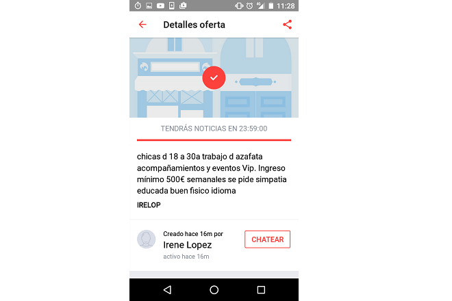 La sorpresa llegaría cuando las aplicantes para la plaza accedían a contactar con la persona responsable de la oferta laboral, descubriendo que la letra pequeña de la misma era mucho más específica. Disponibilidad de lunes a sabado de 10:30 a 20:00 de la tarde, que ese sueldo de 500 € podía ampliarse a 700 y 900, y que el requisito fundamental para el trabajo era prostituirse manteniendo relaciones sexuales con los clientes.