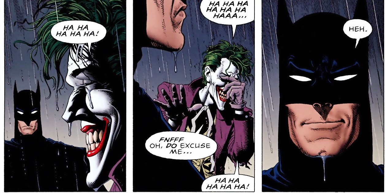 Esto se hace evidente en "El chiste de la muerte". Después de paralizar a Barbara Gordon y atormentar a su padre Jim, el Joker finalmente logra contar un chiste que hasta Batman encuentra gracioso.