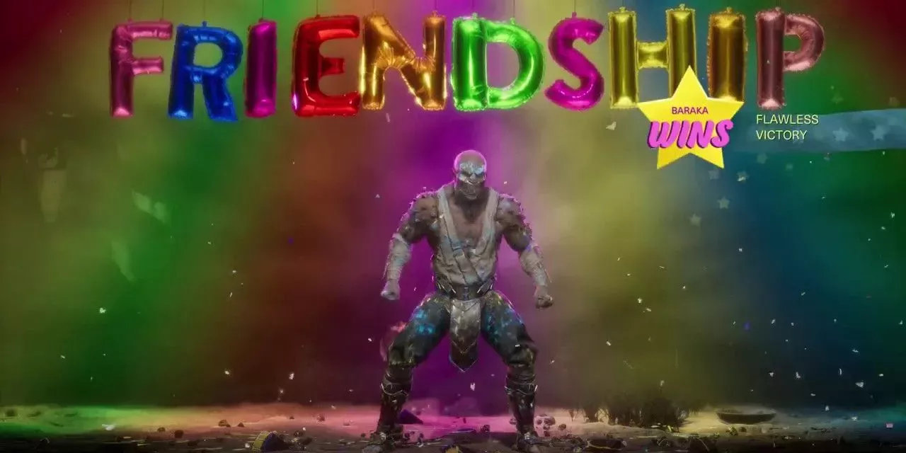 Baraka no tiene el mejor historial de amistades. La del MK11 no es diferente. Baraka presenta una tarta de cumpleaños antes de lanzarla al aire. Utiliza sus cuchillas para cortar la tarta y crear un desastre. Después de sus amistades muy simplistas en MK2 y MK3, es una gran decepción que MK11 no haya hecho más con Baraka y sus cuchillas.