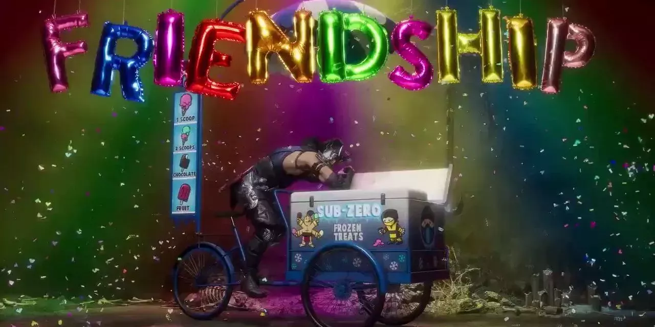 Su Amistad comienza con él expresando alegremente su emoción de forma infantil antes de salir corriendo de la pantalla. Regresa montado en una bicicleta de helados. Mete la mano en el congelador, coge un palito de helado y utiliza sus poderes de hielo para crear un helado. La alegría que siente Sub Zero por el helado es tan graciosa como creíble.