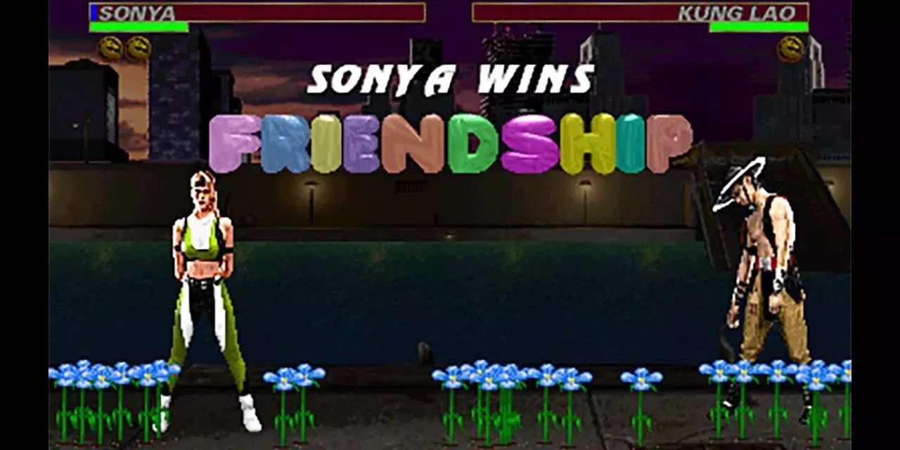 En UMK3, Sonya posa antes de que crezcan flores a su alrededor. Si bien es un paso adelante respecto a la anterior, no deja de ser decepcionante. Por suerte, la Amistad de Sonya en MK11 compensó esto haciéndola jugar a buscar a uno de sus robots. El robot le devuelve a un Tarkatan muerto para que lo apruebe.