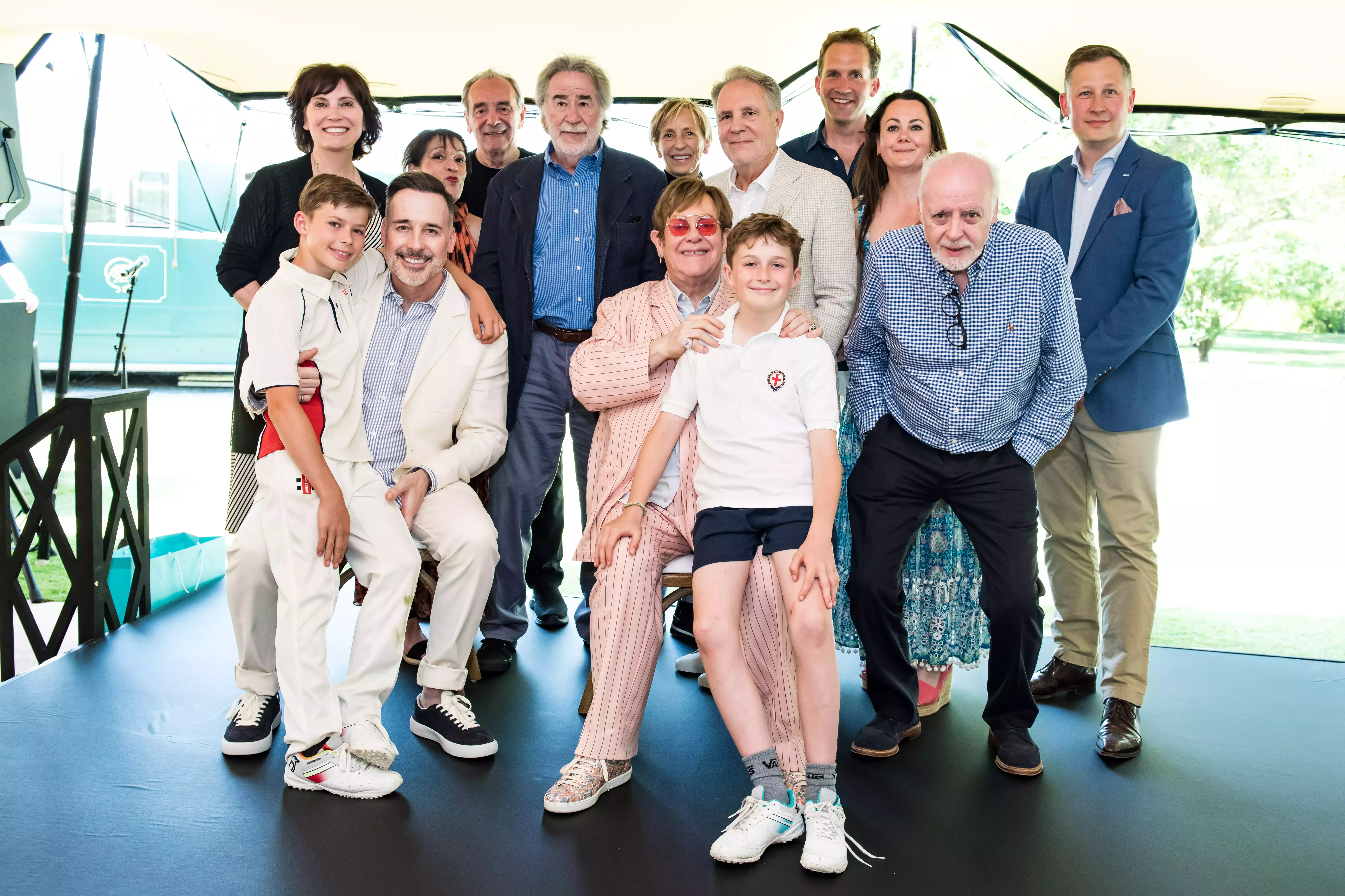 De izquierda a derecha, detrás de Elton, David Furnish y sus dos hijos Elijah y Zachary: Donna DiBenedetto (AEG Presents), Doris Dixon (Marshall Arts), Barrie Marshall (Marshall Arts), Howard Rose, agente de Elton desde hace muchos años, Debra Rathwell (AEG Presents), Marciano, Luke Lloyd-Davies (Rocket Entertainment), Rachael Paley (Rocket Entertainment), Keith Bradley (director de la gira de Elton John) y Ben Martin (Rocket Entertainment).
