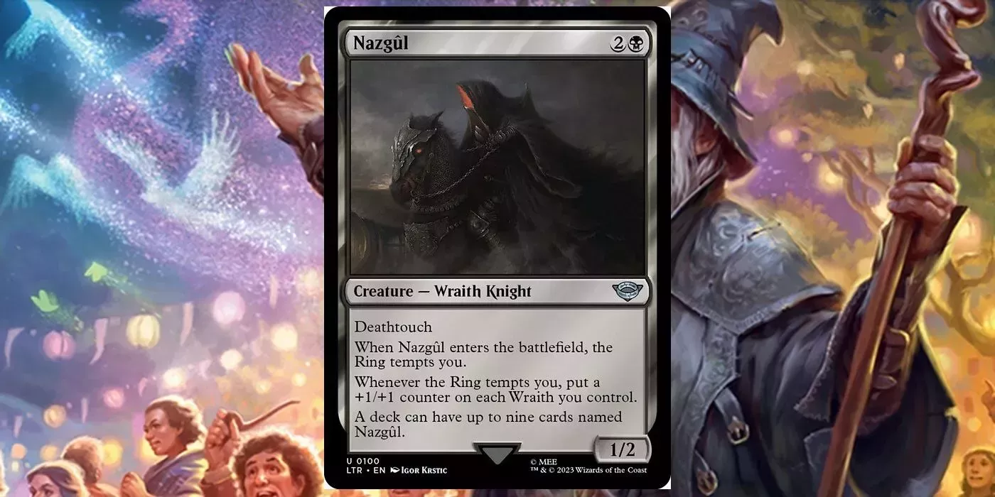 Los nueve Nazgûl son los cazadores de Anillos más elitistas de Sauron, figuras de túnica negra montadas en caballos de aspecto malvado que acechan la Tierra Media para encontrar el Anillo Único cueste lo que cueste. En términos de juego, la criatura Nazgûl poco común es mediocre, pero tiene una mecánica única que sólo se ha visto en un pequeño puñado de otras cartas; una baraja puede tener hasta nueve copias de Nazgûl. Es una combinación perfecta para los nueve espectros del anillo que una vez fueron los nueve reyes humanos a los que Sauron regaló Anillos de Poder.