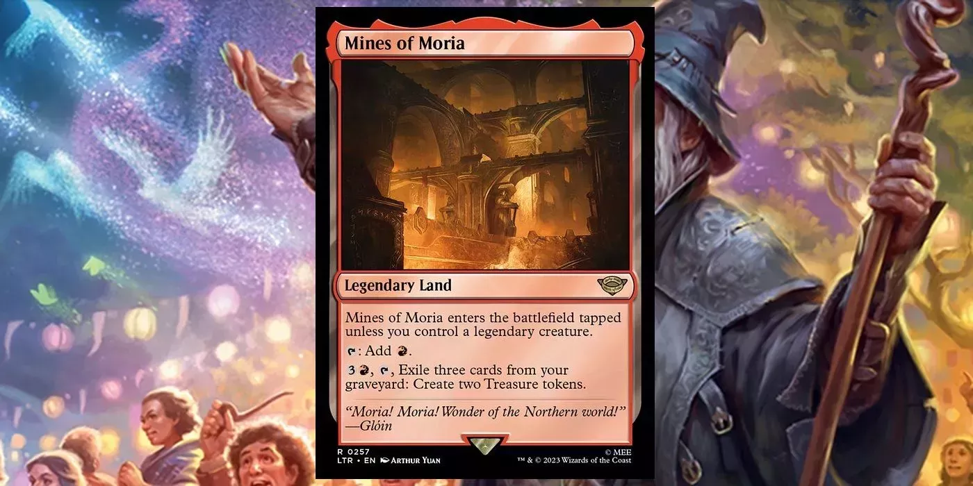 Minas de Moria puede aprovechar el maná rojo, ya que se basa en la tierra, pero también crea fichas de tesoro. El jugador puede exiliar tres cartas de su cementerio y pagar maná para crear dos tesoros, que representan enanos minando la tierra para conseguir valioso oro.