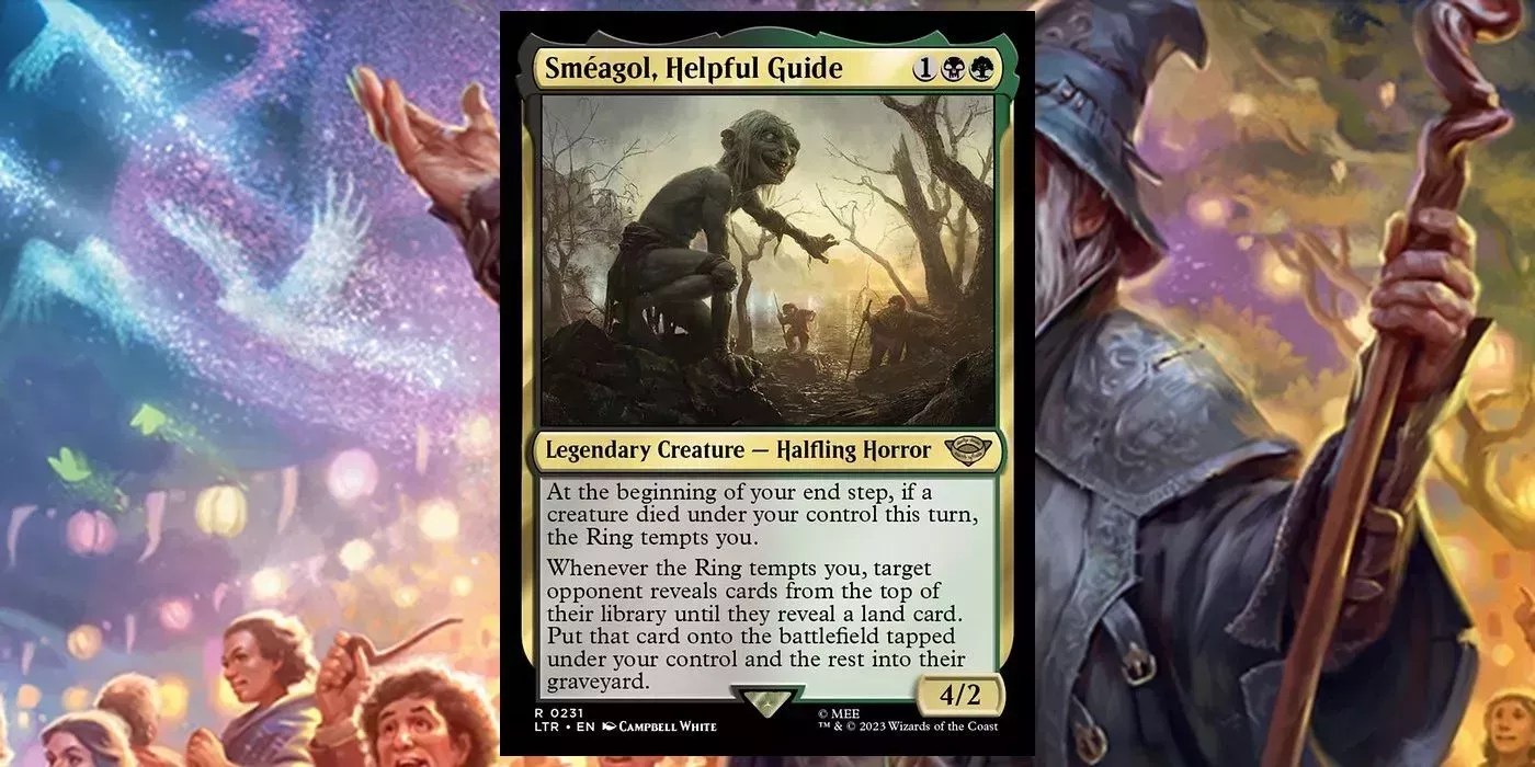 Cada vez que el Anillo tiente al jugador, Sméagol molerá a un oponente hasta que revele una carta de tierra, y el jugador de Sméagol la pondrá en el campo de batalla girada bajo su control. Eso representa a Gollum ayudando a Frodo y Sam a explorar nuevas tierras exóticas lejos de los confines familiares de su lejano hogar en la Comarca, mientras que en última instancia ayuda a perseguir sus propios objetivos.
