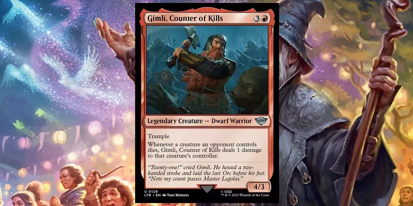 El enano Gimli es conocido por su amistosa competición con Legolas, en la que ambos se superan mutuamente contando los enemigos que matan en batalla. Aparte de los memes de "¡eso solo cuenta como uno!", la naturaleza competitiva de Gimli también da lugar a grandes cartas de MTG , como Gimli, Contador de muertes.