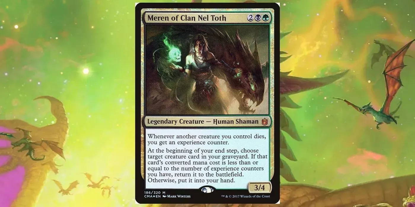 Meren del clan Nel Toth es otro querido clásico de Commander que apareció por primera vez en Commander 2015. Meren es una de las varias leyendas de color enemigo cuyos efectos aumentan con los contadores de experiencia, un efecto genial que Commander Masters debería reintroducir en el juego.
