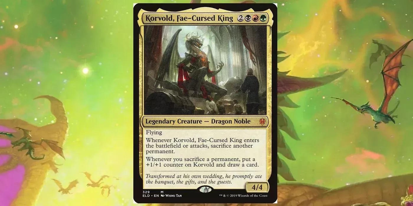 Korvold, Rey Fae Maldito tuvo su única impresión en la colección Trono de Eldraine como criatura rara mítica. Dado que la colección Wilds of Eldraine saldrá a la venta en 2023, Commander Masters es el lugar adecuado para reimprimir a Korvold y entusiasmar a los fans con más aventuras de cuento de hadas en Eldraine, con nobles dragón y todo.