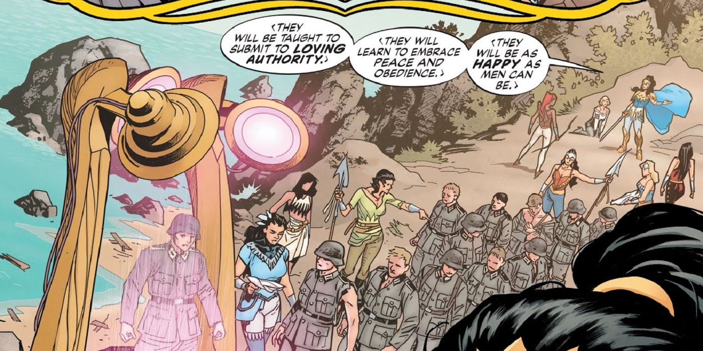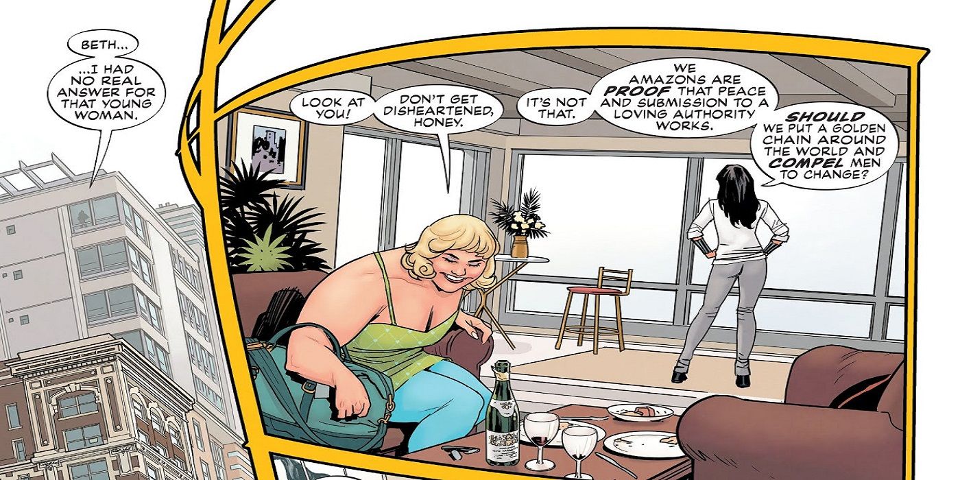 Una de las partes más memorables de la Mujer Maravilla : Tierra Uno es la discusión del libro sobre la obediencia y la sumisión a una autoridad amorosa. Esta decisión vino del hábito de Grant de volver a leer viejas historias sobre los personajes. Aprendieron sobre la encarnación del personaje en los años 40, que presentaba cosas como el canguro montado y los amazónicos sometiéndose para crear una sociedad más armoniosa.