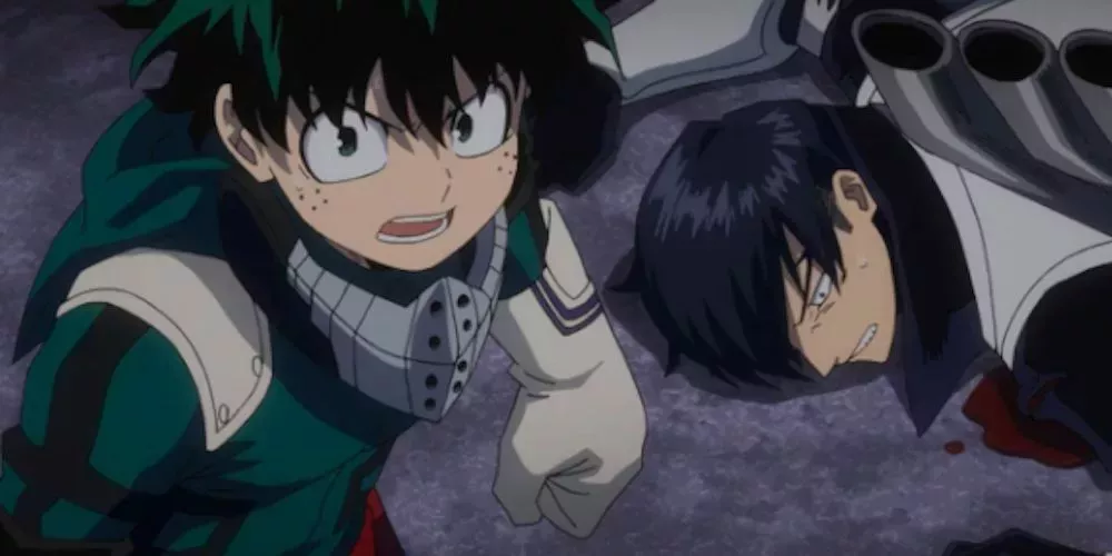 Deku da un fuerte golpe en la cara de Stain, salvando la vida de Tenya y ganando tiempo suficiente para que Shoto se una a la batalla. En My Hero Academia, la intromisión de Deku es casi siempre apreciada.