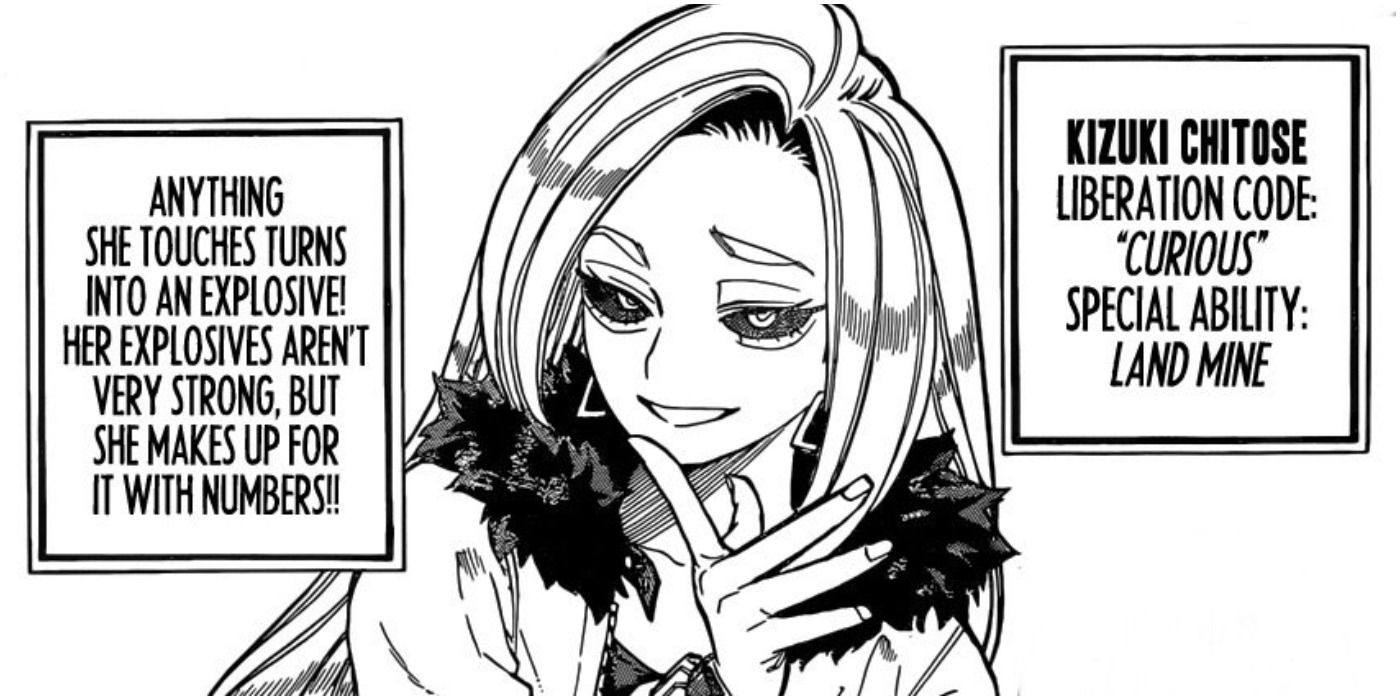 Al igual que Bakugo, Chitose Kizuki puede producir explosiones con sus manos, pero lo hace de una manera muy diferente. Su Quirk de mina terrestre le da la capacidad de convertir cualquier cosa que toque en un explosivo, y puede detonarlo cuando quiera.
