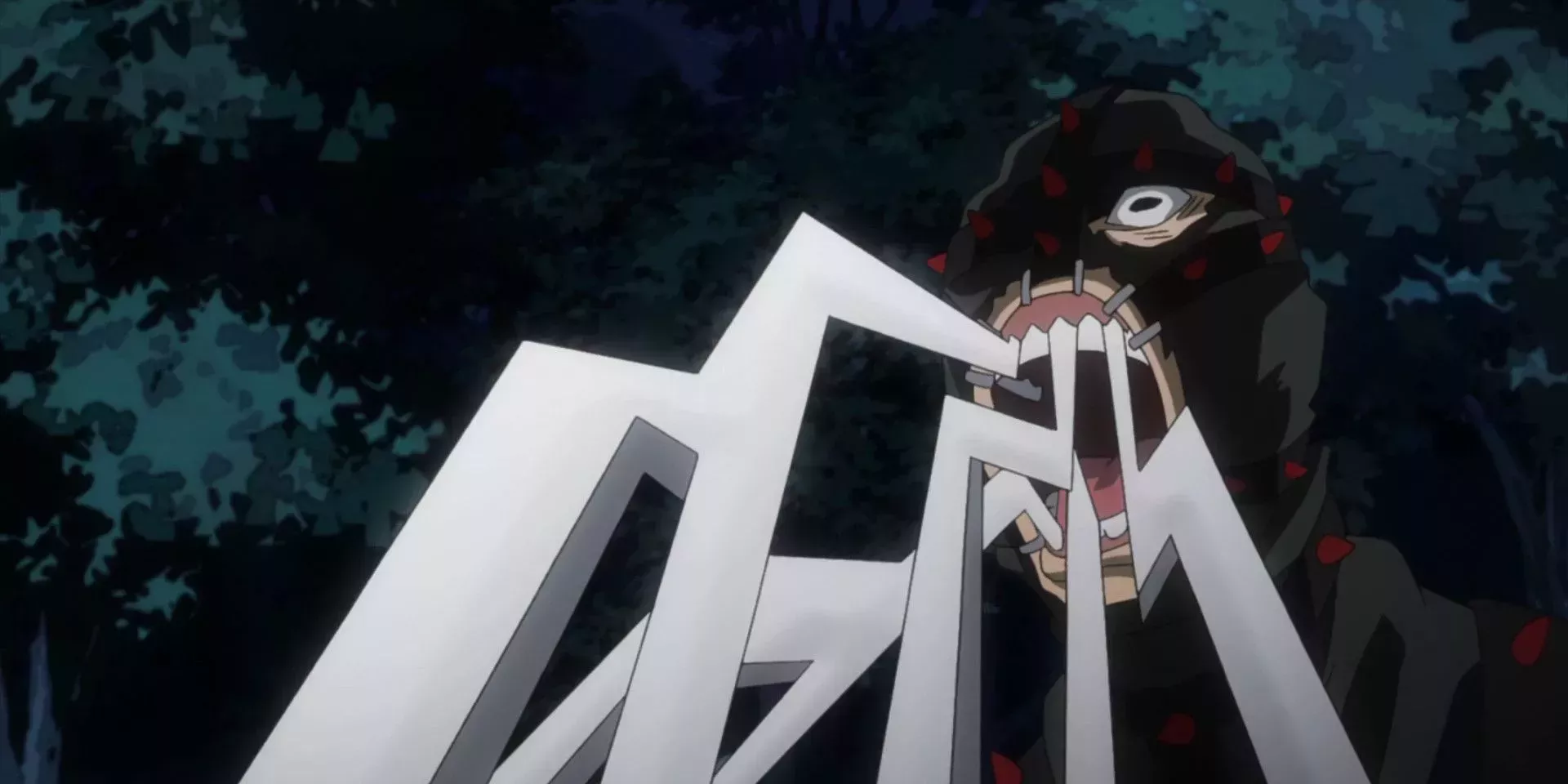Moonfish se presenta encorvado sobre la mano cortada de Mezo Shoji, miembro de la Clase 1-A de la UA, mostrando inmediatamente su sed de sangre con sus aterradores gemidos y su comportamiento general. Esto hace que su Quirk Diente de Cuchilla se convierta inmediatamente en un obstáculo formidable y aterrador que los estudiantes deben superar.