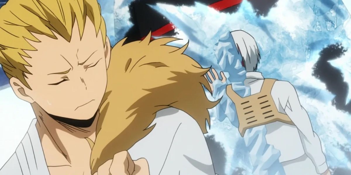 A continuación, se acerca tranquilamente al puntal de la carga nuclear y lo toca en la superficie, lo que otorga la victoria a su equipo. Esta demostración de poder es suficiente para que Bakugo se ponga nervioso ante la perspectiva de luchar contra Shoto.