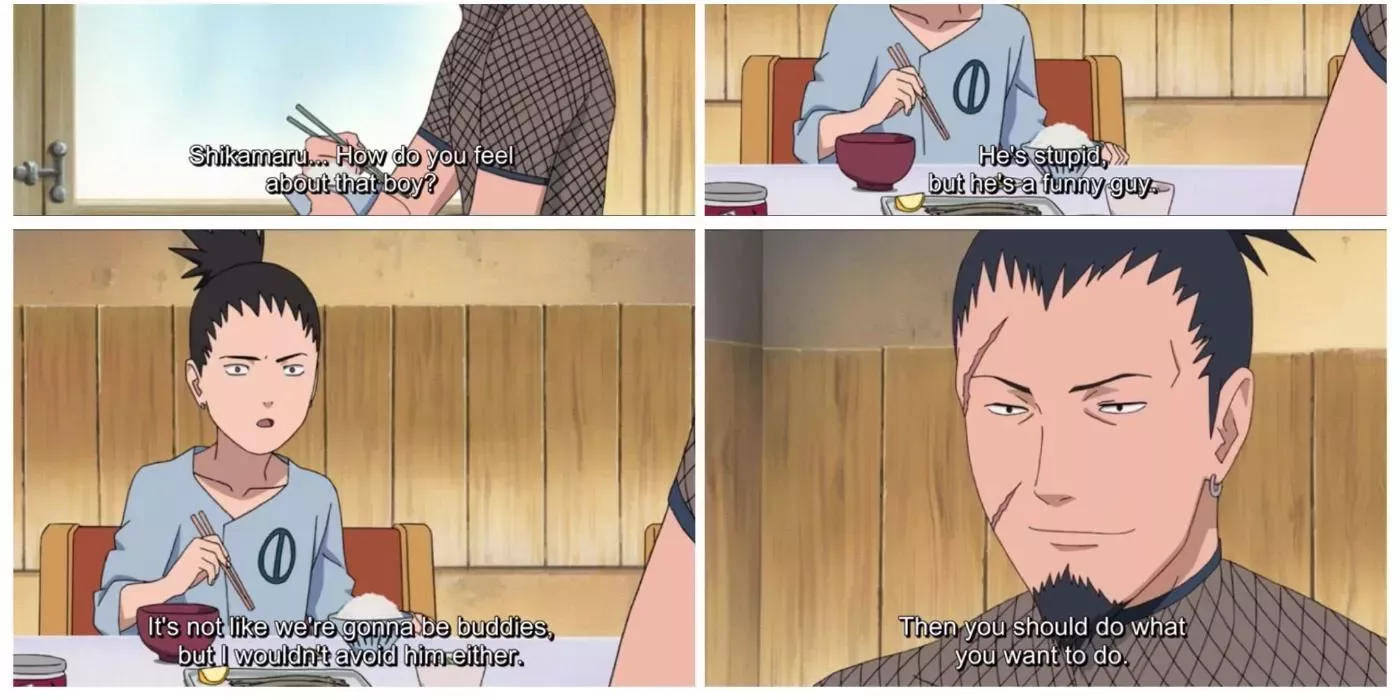 Cuando Shikamaru arremetió como resultado de su dolor, Shikaku le indicó que liberara su tristeza. A continuación, le afirmó que estaría allí para recoger los pedazos. Shikaku siempre estuvo presente en la vida de Shikamaru, y ese momento tan conmovedor fue la ilustración perfecta del padre alentador y dedicado que era Shikaku.