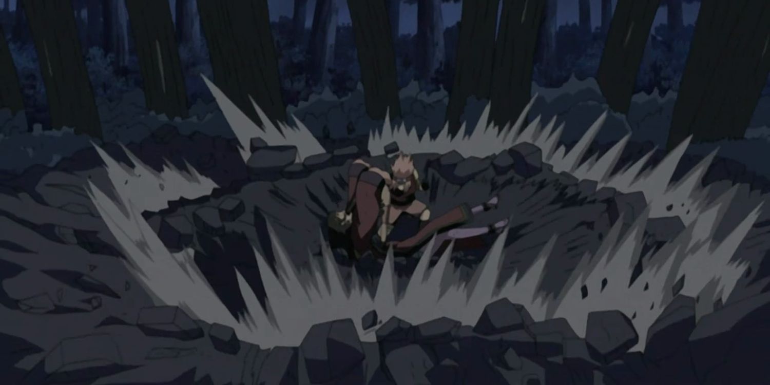 A continuación, procedió a utilizar su técnica de Impacto de Flor de Cerezo en el suelo, rompiéndolo en pedazos y revelando a Kakashi escondido debajo de él.