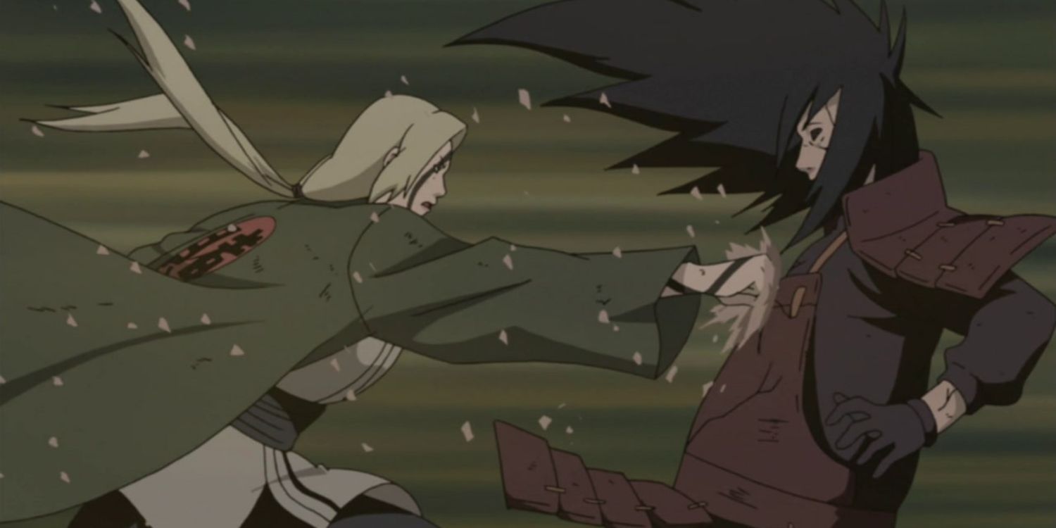 Una vez serio, Madara limpió fácilmente el suelo con los Kage e incluso cortó el cuerpo de Tsunade por la mitad. Aunque esto debería haberla matado, Tsunade terminó sobreviviendo y salvó a la otra Kage también.