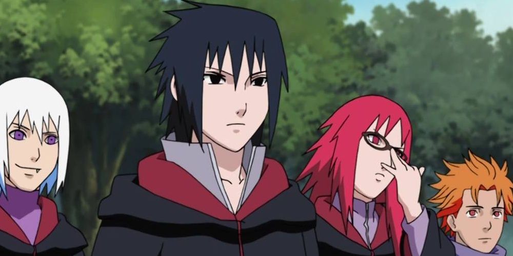 Aunque se trata de un equipo improbable, la búsqueda de Sasuke dio a los cuatro jóvenes una dirección, un propósito y un sentido de comunidad. Aunque en general trataba bien a sus nuevos amigos, consideraba a Karin prescindible durante la lucha contra Danzo Shimura. Probablemente, esto se debía a su parecido con Sakura Haruno y a que consideraba sus obsesiones románticas como una molestia.