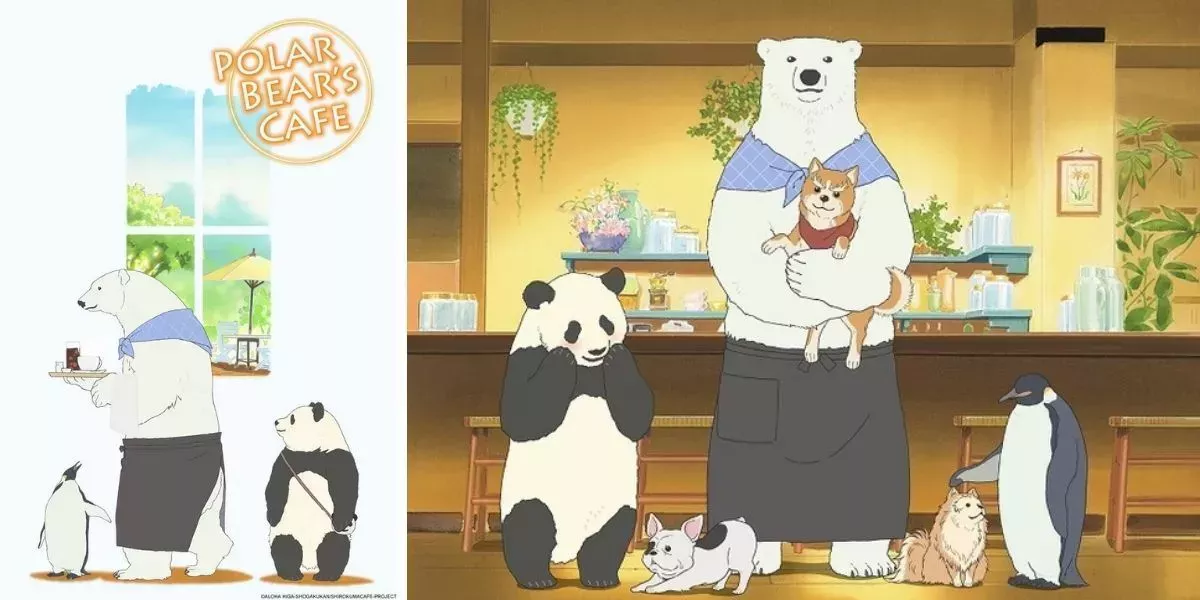 2 El Café del Oso Polar es un éxito entre los clientes humanos y animales (Polar Bear Café)Polar Bear Café, también conocido como Shirokuma Café, tiene lugar en una cafetería literal que sirve a los clientes humanos y animales con alimentos y bebidas orgánicas. El personal no sólo incluye osos polares, sino también un pingüino e incluso un oso pardo. Sasako es el único miembro humano del personal de la cafetería y se ganó el puesto de trabajo allí después de que Panda intentara solicitar un empleo y fracasara en su entrevista. En la cafetería se sirven platos como el naan, el guiso de crema de salmón, el hielo raspado y las albóndigas.