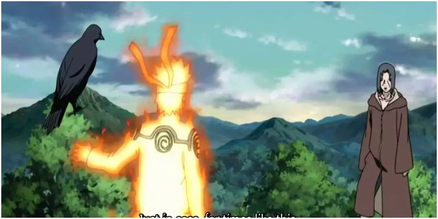 Durante su conversación dentro del genjutsu de Itachi, éste obliga a uno de sus cuervos a pasar por la garganta de Naruto. Le dice que le está dando parte de su poder, pero espera que no tenga que usarlo. Este extraño acto no tiene sentido hasta el comienzo de la Cuarta Guerra Shinobi.