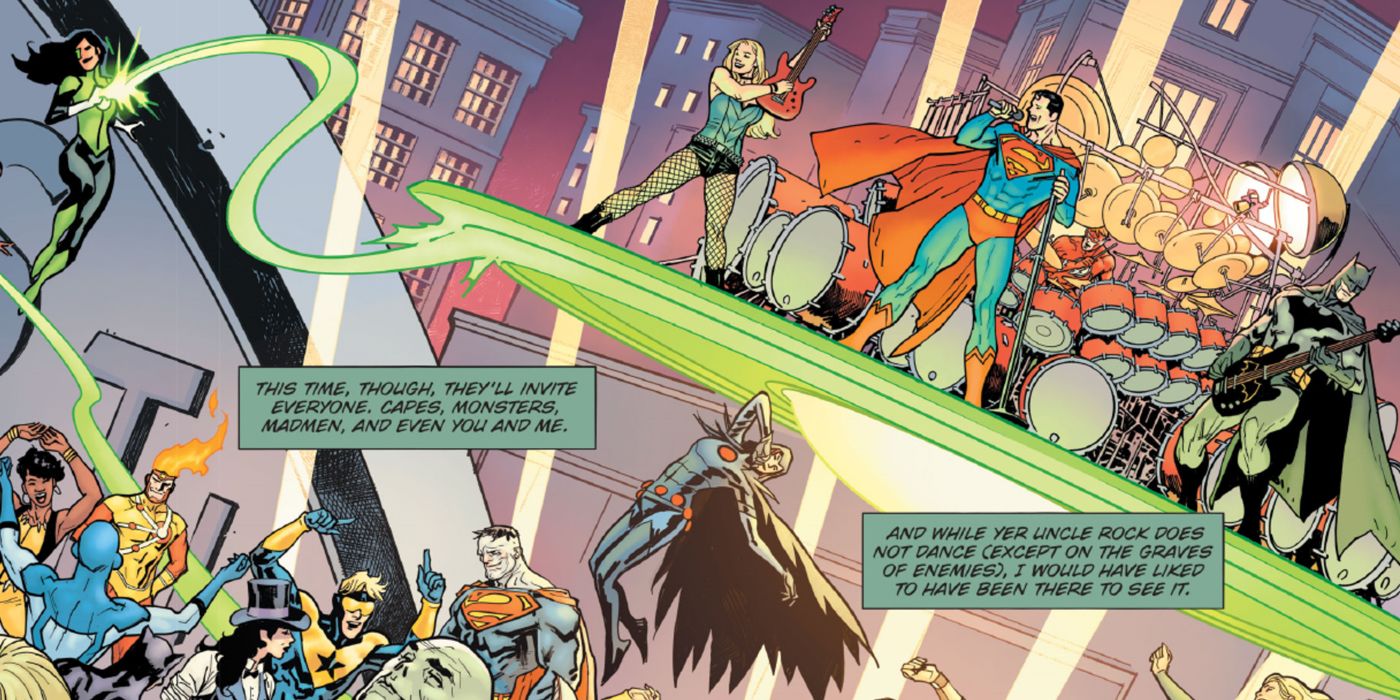 Empujando esa pregunta están las últimas páginas de Noches Oscuras: Death Metal donde vemos al Sargento Rock luchando junto a una versión de la Sociedad de la Justicia que se acerca a lo que conocemos pero es diferente. Una gran diferencia es que no hay ningún Canario Negro o Mujer Maravilla en el equipo, pero Liberty Belle - que fue miembro del Escuadrón de Estrellas, no de la JSA - está ahÃ. ¿Es eso un indicio de otros cambios que podemos ver?