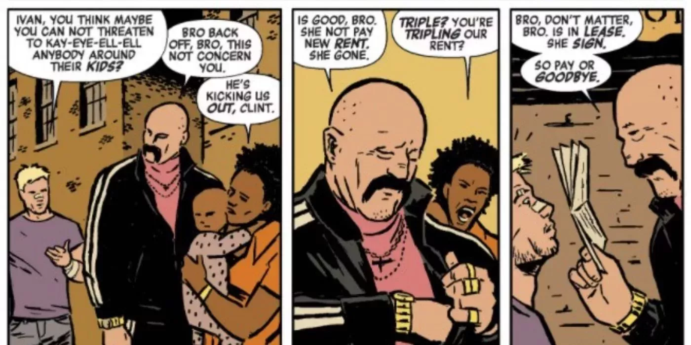 Sin embargo, el principal villano del cómic de Ojo de Halcón de 2012 no es una persona o una organización. Es el aburguesamiento. La historia comienza con la Mafia del Chandalismo triplicando los alquileres en el complejo de apartamentos de Ojo de Halcón para obligar a los inquilinos a irse a la calle y así poder readaptar el edificio para ganar más dinero. Esto no es sutil y los elementos de esto forman una tendencia recurrente a lo largo de Hawkeye.