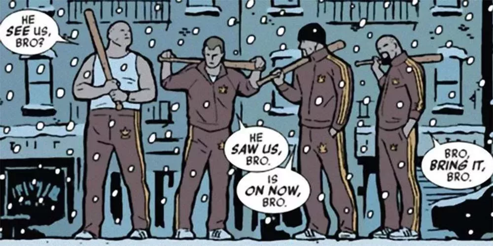 6 El principal villano es el aburguesamientoEn el cómicde Ojo de Halcón se presentan varios villanos. La Mafia del Chándal son los principales villanos que se ven en todo momento, pero Kingpin, Madame Masque y AIM también hacen apariciones.