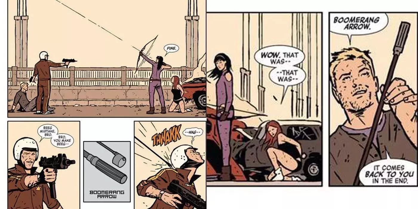 Las flechas de Ojo de Halcón fueron ligeramente desacentuadas en las películas del MCU, que resaltaron la precisión de Barton, que nunca falla, por encima de las puntas de flecha de los artilugios que, de otro modo, tendrían dificultades para competir con la armadura de Tony. La nueva miniserie tiene una gran oportunidad de corregir el desequilibrio, y con un ojo puesto en la diversión consciente de Fraction y Aja, algo como la flecha boomerang puede muy bien ser una parte de todo esto.