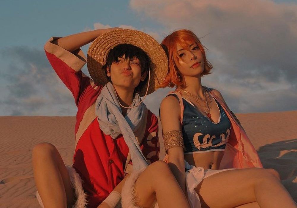 Este es un aspecto más tradicional para los personajes de los cosplayers de Mugimugicrew. Cada uno de los personajes está colocado como es de esperar, Nami con su bastón estirado a la espalda, lista para plantárselo a alguien en la cara si es necesario.