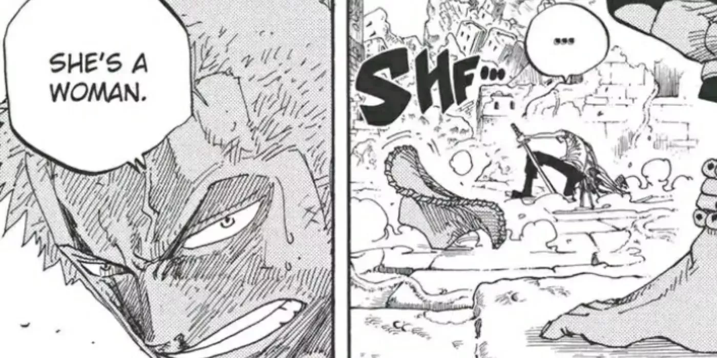 Una vez más, Zoro se enfrentó a una mujer durante el arco de Punk Hazard y, como era de esperar, optó por no luchar seriamente contra ella. Monet sospechó que Zoro no haría daño a una luchadora, lo que Zoro trató de disipar demostrándole que estaba dispuesto a entrar a matar.