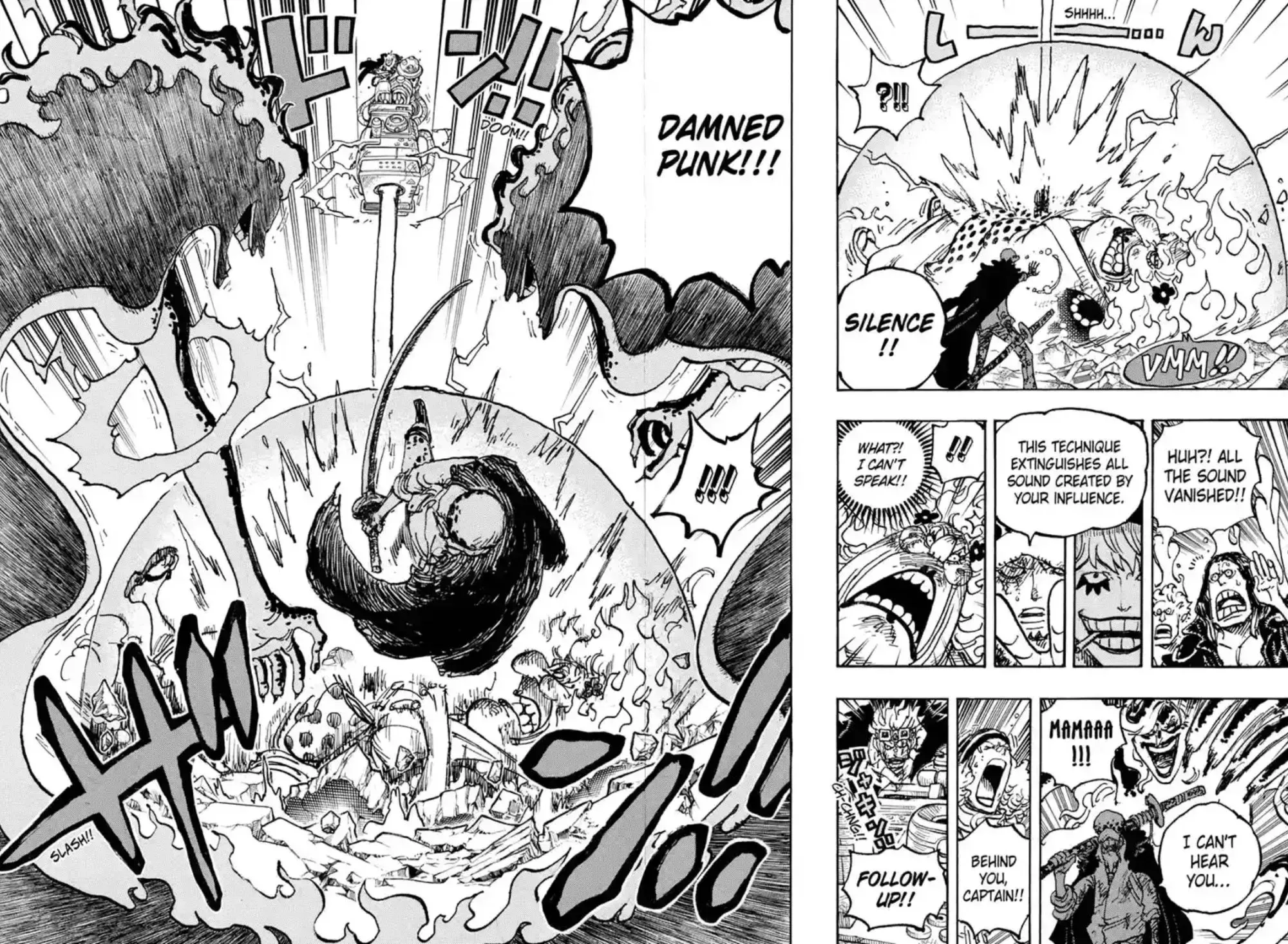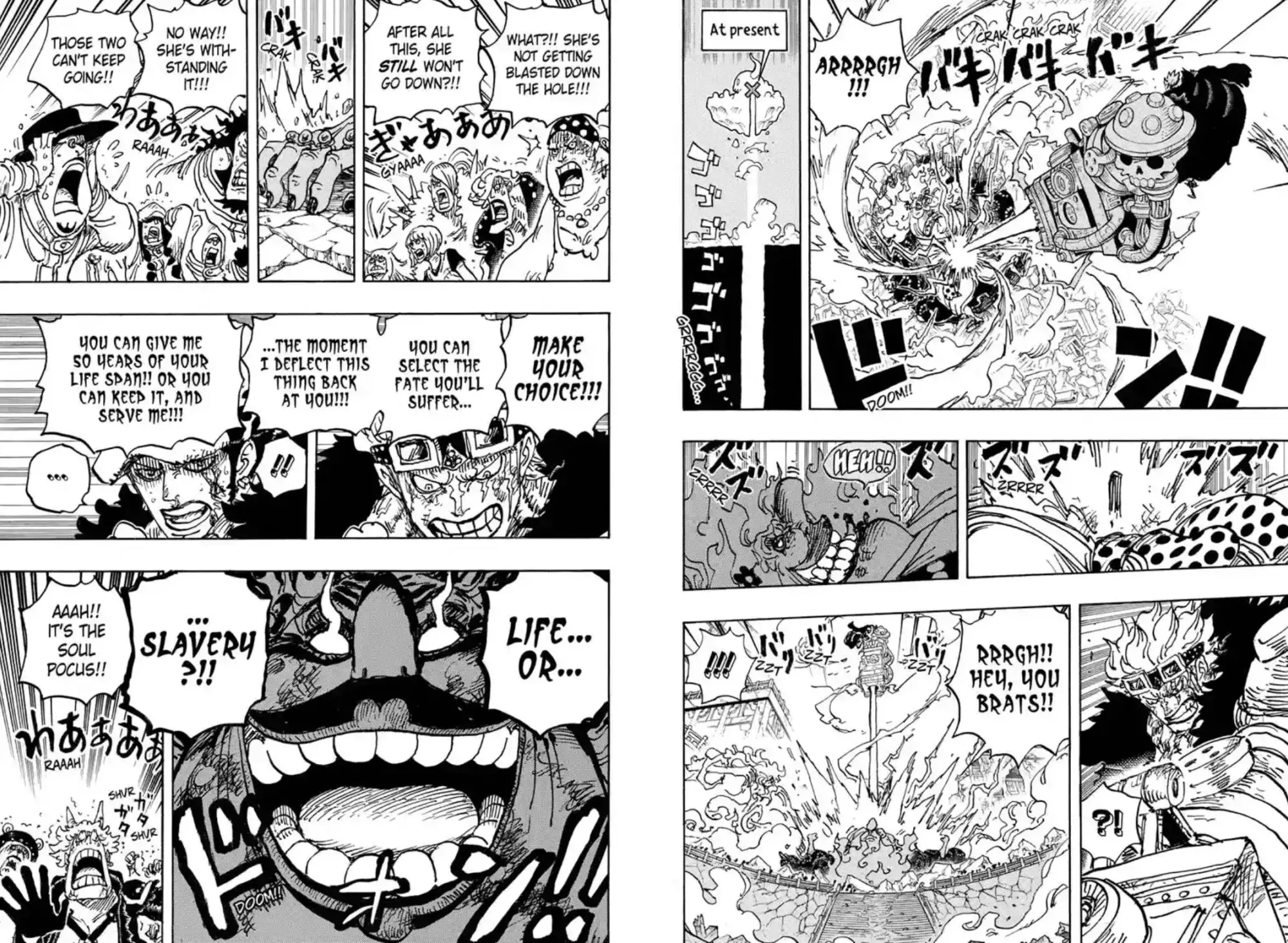 En el capítulo anterior, Big Mom pudo resistir el asalto de Kid y Law, pero a duras penas. A pesar de sus esfuerzos, volvió a ponerse en pie y reveló una nueva habilidad llamada Cañón de Visita de la Madre: 3.000 Leguas de Miseria. Para sorpresa de todos, el ataque era otro Homie y tenía vida propia. En un último empujón, Law hundió su espada profundamente en el pecho de Big Mom, la hoja de su espada se extendió a través de su cuerpo, por la isla y hasta el suelo. Mientras su equipo le rogaba que se alejara, liberó su ataque Puncture Wille, enviando una onda expansiva por todo el cuerpo de Big Mom y creando un cráter en el suelo bajo Onigashima. Mientras ella seguía tambaleándose por el ataque de Law, Kid lanzó el suyo, llamado Damned Punk, disparando un gran cañón láser contra Big Mom.