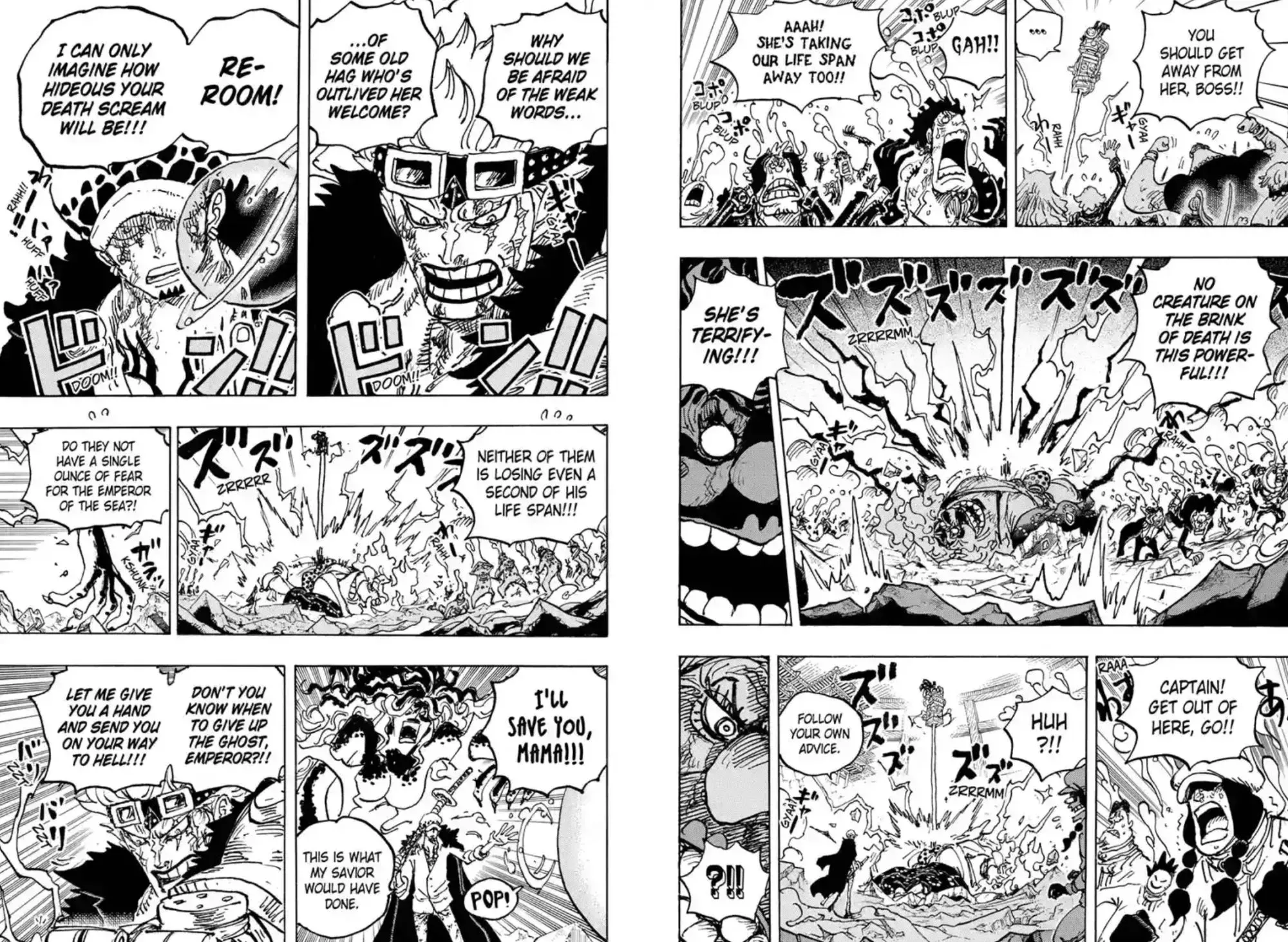 Sorprendidos por el hecho de que Big Mom no parece inmutarse por los esfuerzos de Kid, incluso el equipo de Law empieza a intentar convencerle de que se retire, pero él les dice que sigan su propio consejo. Kid se reafirma en que Big Mom no le asusta y Law activa su habilidad Re-ROOM, molesto al pensar en cómo sonará su grito de muerte. Su valentía y el hecho de que sus vidas no se agoten conmocionan a los hombres que les rodean, teniendo en cuenta que Big Mom es un emperador del mar.