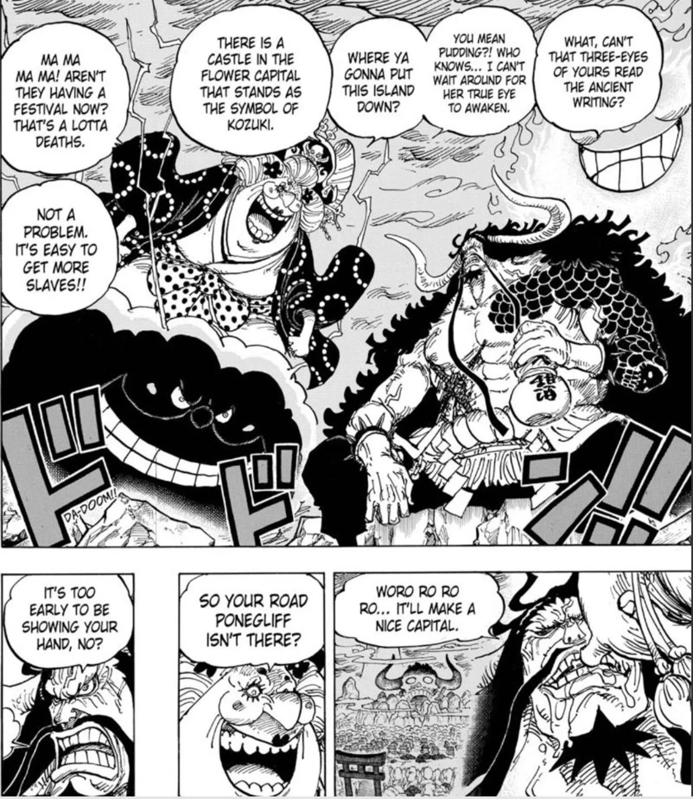 Kaido suponía que la hija número 35 de la Gran Mamá y la ex-prometida de Sanji, Pudding, podía leer el texto antiguo con su tercer ojo. La Gran Mamá aclara que tiene que desbloquear su verdadero poder para hacerlo, pero no espera para siempre a que suceda. Tiene curiosidad por saber dónde va a aterrizar Onigashima cuando lleguen al continente. Kaido dice que planea aterrizar en la capital de las flores, donde los kazakos vivieron hasta el golpe de estado de Orochi. El hecho de que Onigashima sea la nueva capital de Wano será una excelente representación del poder de Kaido sobre el país samurái.