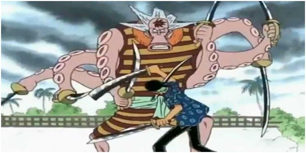 7 Zoro mata a Hatchan en su pelea a pesar de que Hatchan tiene más espadas que Zoro (Arlong Park Arc)
