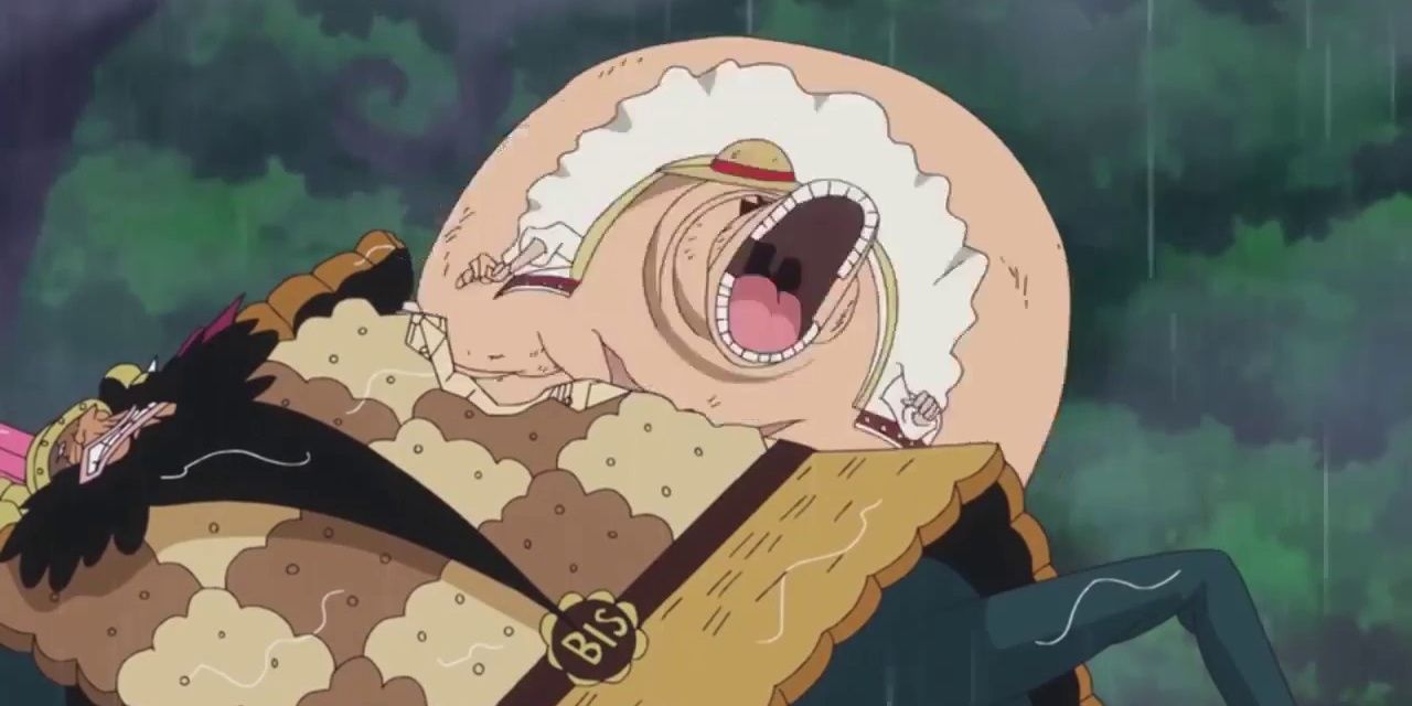 Para derrotarlo, Luffy tuvo que comerse todos los soldados de galleta que creó, todo gracias a su enorme apetito hecho posible por los poderes del Gomu Gomu no Mi.