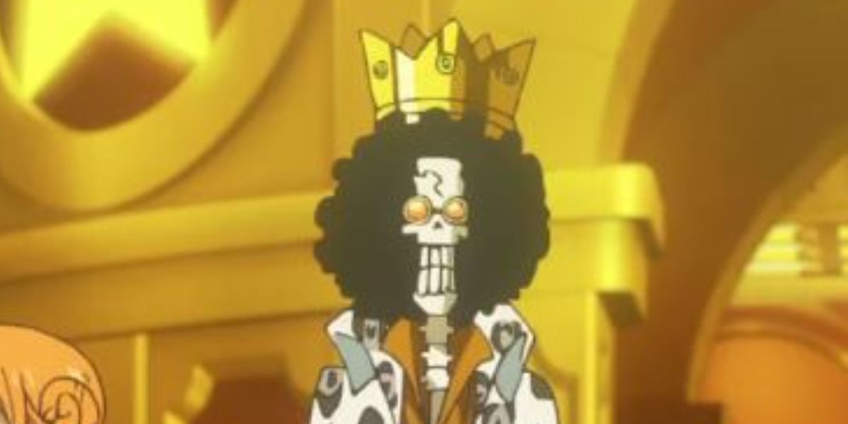 La pelÃculaOne Piece Film: Gold muestra lo bien que se desenvuelve Brook, mostrándolo con al menos siete trajes diferentes. Uno de sus atuendos más emblemáticos es una corona dorada sobre su afro. Al fin y al cabo, cuando se trata de sombreros, hay que ir hasta el final o irse a casa. Desgraciadamente, es tan alto que la corona sólo es visible en unas pocas tomas mientras la lleva.
