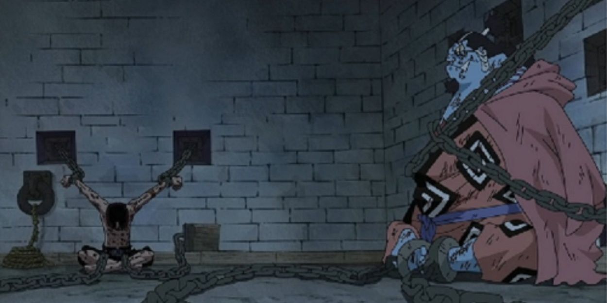 La primera presentación de Jinbe no fue nada destacable. Tras ser apaleado por uno de los monstruos de Sadi por un crimen desconocido, se quedó conversando en la oscuridad con Ace Puño de Fuego, sirviendo principalmente de musa para que hablara de su hermano adoptivo.