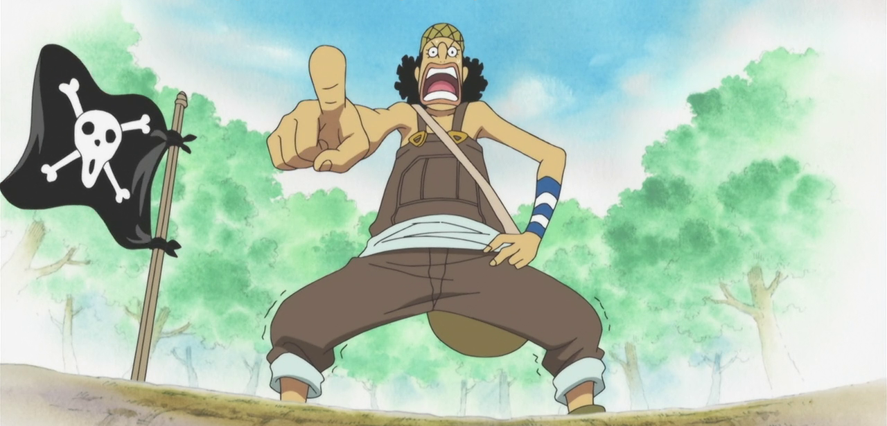 La introducción de Usopp resume bien la esencia de su personaje. Cuando los Sombreros de Paja se adentraron en la bahía, les amenazó con los "vastos ejércitos que comandaba", que acechaban justo detrás de los árboles y fuera de la vista.