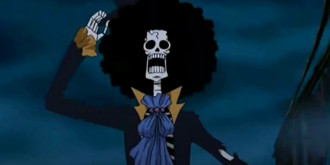 Brook se presentó como un esqueleto a bordo de un barco embrujado en el Triángulo de Florian. Intrigado por el cadáver y la posibilidad de encontrar un tesoro, Luffy subió rápidamente a bordo y descubrió que el hombre seguía vivo.