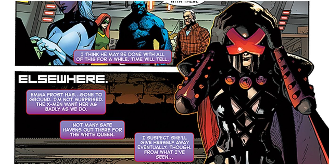 Emma Frost emerge como la verdadera arquitecta detrás del conflicto. Ella creó la proyección del Cíclope porque el verdadero Cíclope había sido asesinado por la nube. Es confuso, pero básicamente Emma diseñó la guerra entre los Inhumanos y los X-Men para la venganza. Y luego se convierte en una persona malvada adoptando uno de sus disfraces más intrigantes, con una variante del actual casco de Cíclope.
