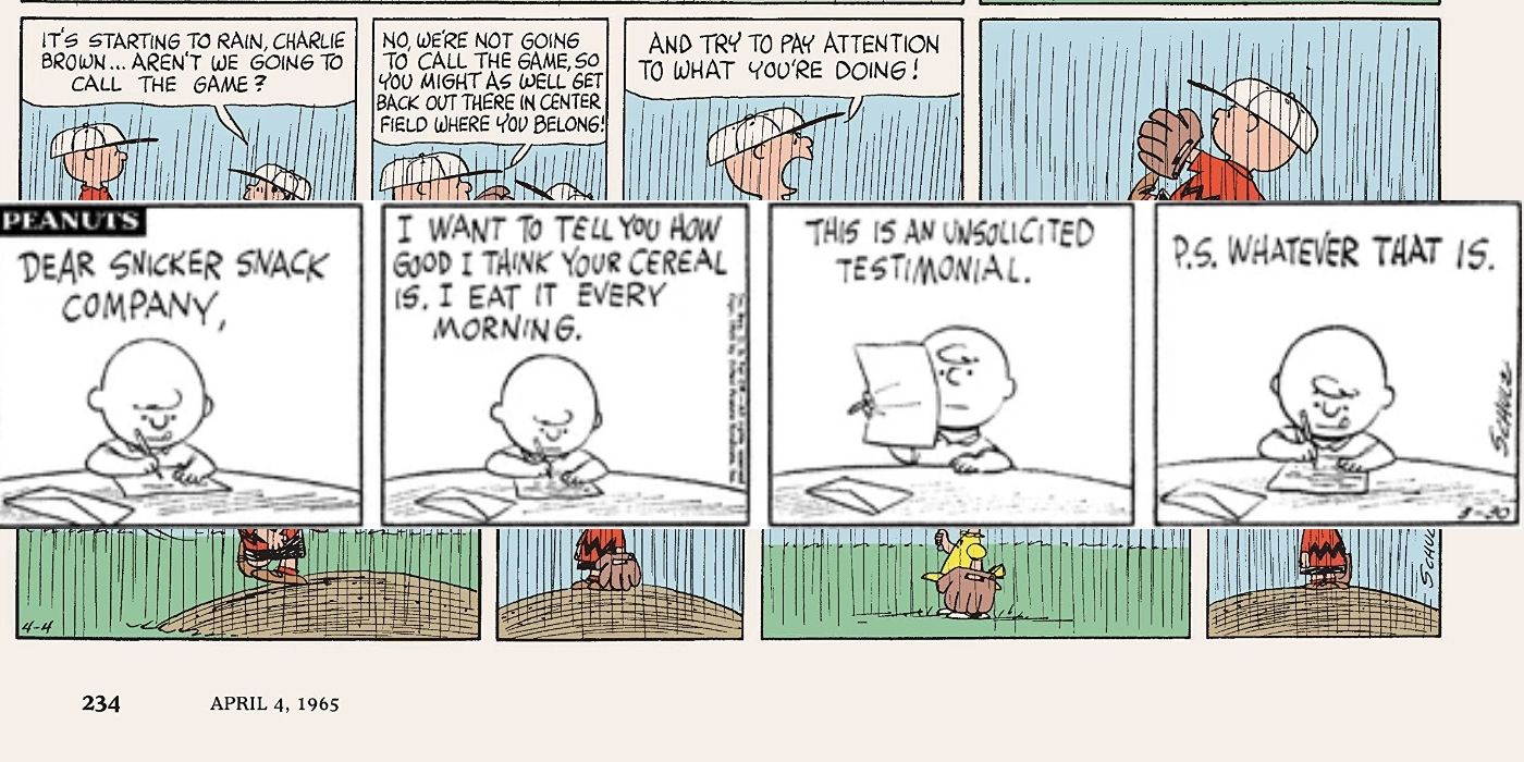 Este fue el tema de este cómic en el que el protagonista de la serie, Charlie Brown, escribe una carta a una de sus empresas de cereales favoritas. Al estilo clásico de Peanuts, tiene que soltar algunas palabras de adulto y, al estilo de un niño, se asegura de incluir que no tiene ni idea de lo que acaba de decir.