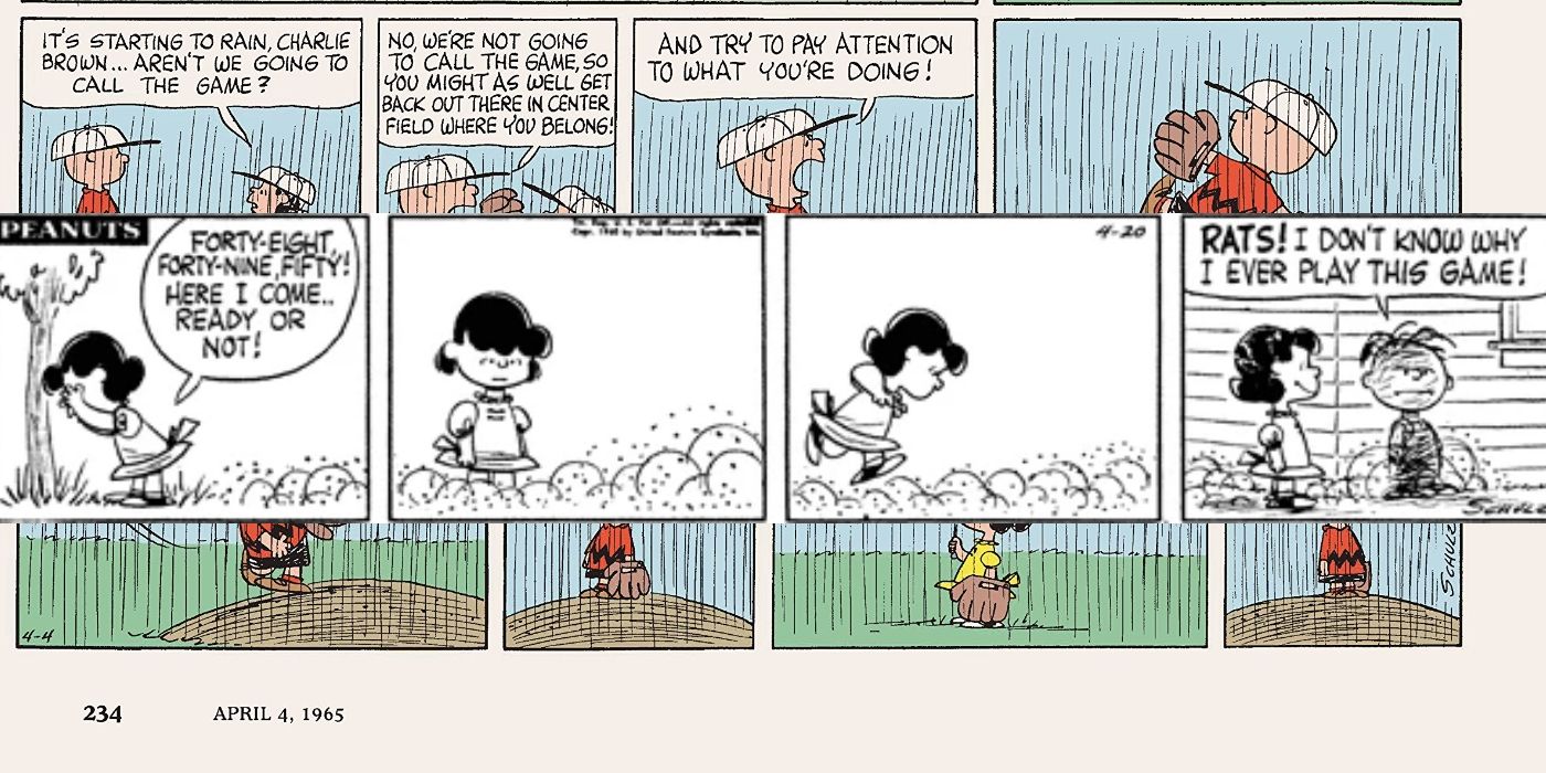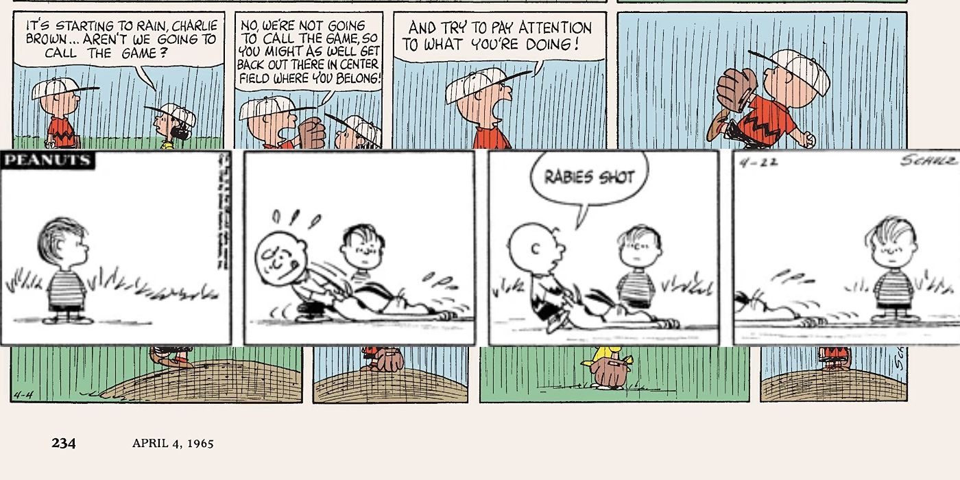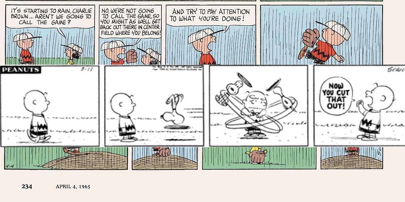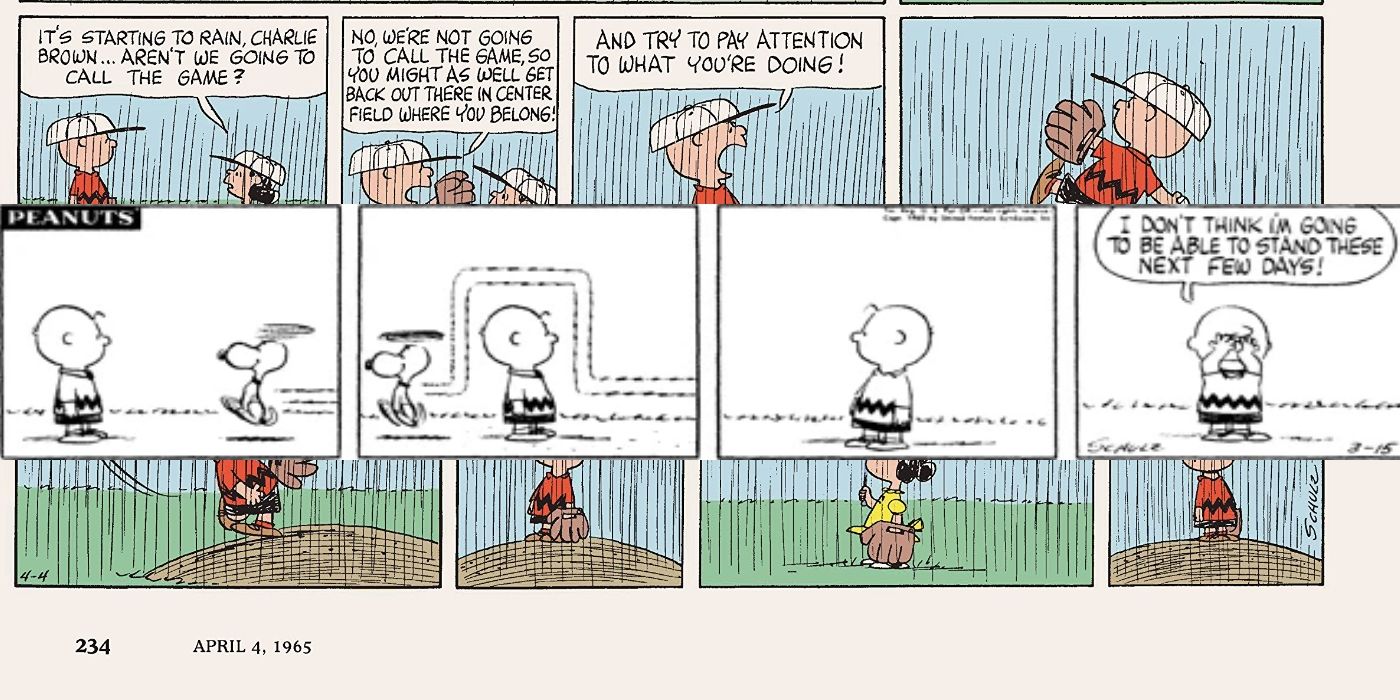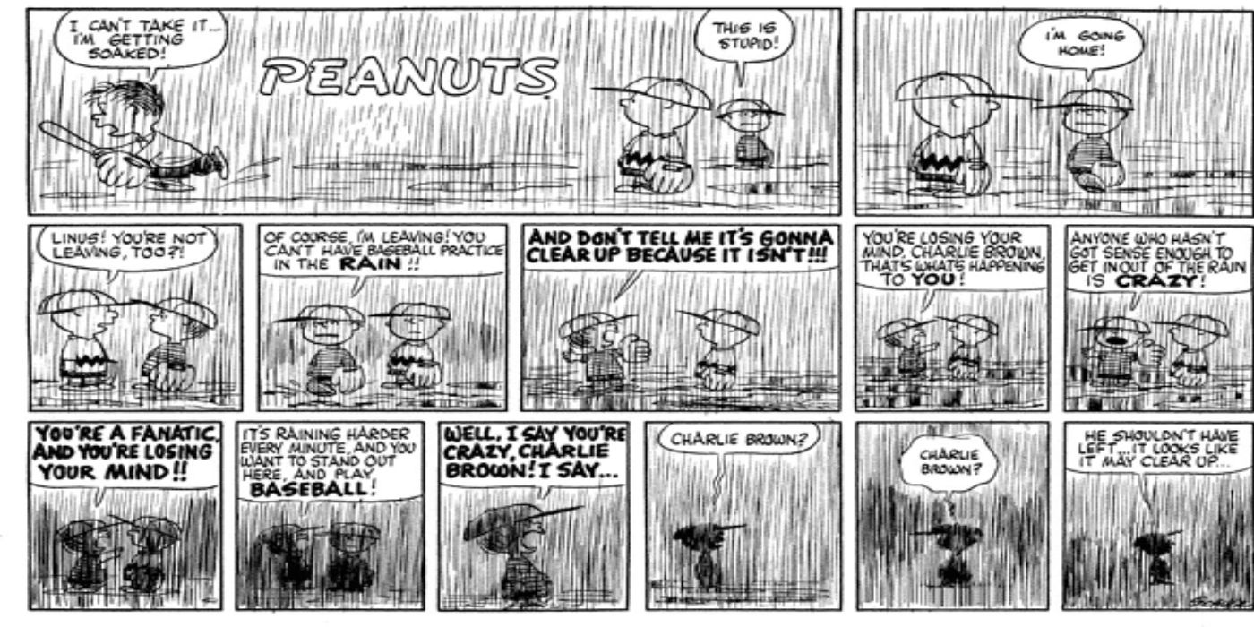 Lo más hilarante de ésta es que, originalmente, Charlie Brown es el defensor de sentarse y esperar a que llueva. Por supuesto, Linus acaba llevándolo al siguiente nivel y se queda fuera más tiempo que nadie.