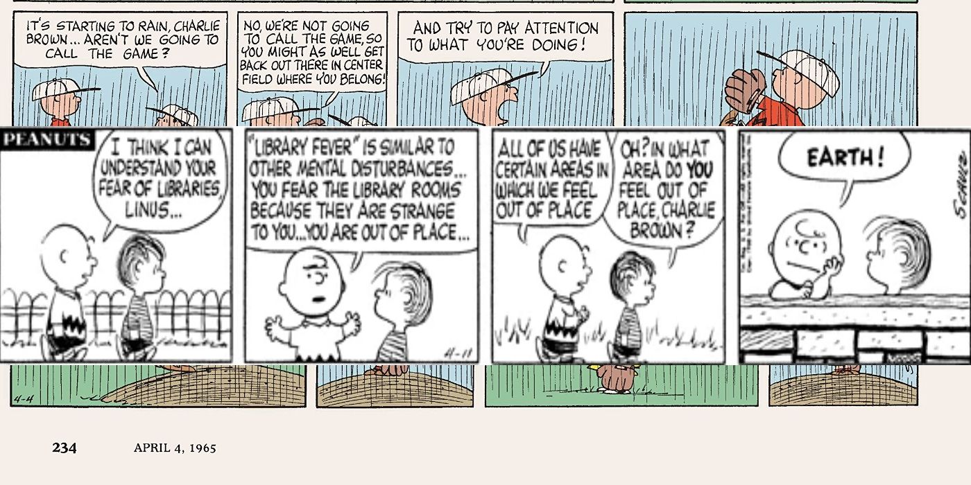 En lo que se puede denominar como la saga de la biblioteca protagonizada por Linus y su viaje de primero temer y luego amar la biblioteca, él y Charlie Brown tienen una de sus famosas conversaciones profundas.